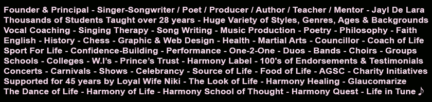 Find us on Facebook Harmony Label @ X The Coach of Life Glaucomarize.org Jayl Music and Poetry @ JAYL TV Recommendation from Step Aside Children's Homes Headway @ Harmony School